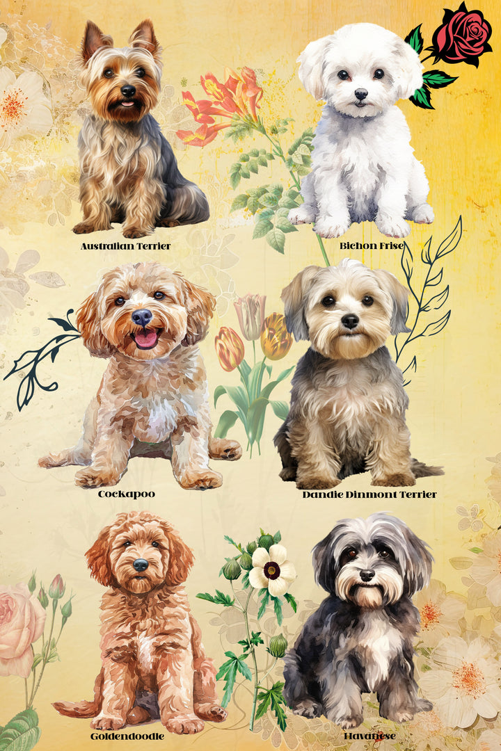 This captivating artwork showcases a collection of six beloved dog breeds, each beautifully illustrated amidst a lush floral background. Featured breeds include the Australian Terrier, Bichon Frise, Cockapoo, Dandie Dinmont Terrier, Goldendoodle, and Havanese, all portrayed with stunning detail and vibrant colour. The whimsical composition blends each dog's unique characteristics with elegant floral motifs, creating a charming and heartwarming display perfect for any dog lover’s home decor.