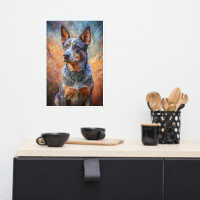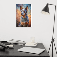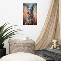 This stunning portrait captures the unwavering loyalty and intelligence of the Australian Cattle Dog. With its keen amber eyes, striking blue merle coat, and proud stance, this artwork beautifully embodies the essence of a true working dog. Set against an artful backdrop of earthy tones and swirling blues, the piece merges realism with artistic expression, making it a perfect addition to any dog lover’s home. Ideal for those who appreciate the spirit of the Australian outback and the companionship of a devoted four-legged friend.