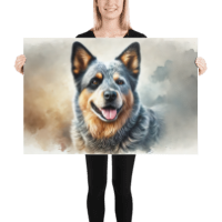 A vibrant, artistic rendering of an Australian Cattle Dog showcasing its intelligent eyes, alert ears, and cheerful demeanour. The artwork features intricate details of the breed’s distinctive blue and tan coat with a painterly splash background that captures the energy and lively personality typical of this working breed.