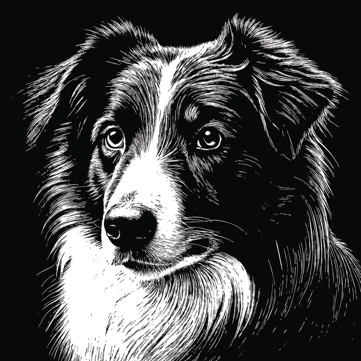 This striking black and white digital artwork captures the detailed facial features and expressive eyes of a Australian Shepherd, highlighting the breed's intelligence and alertness with intricate line work and shading.