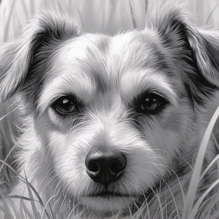 A stunning close-up of an Australian Shepherd puppy peacefully resting in tall grass. The image captures the dog's soulful eyes and flowing fur, highlighting its gentle and alert nature. The monochrome background accentuates the intricate details of the dog's coat and expression, creating a serene and captivating scene of a loyal companion in the wild.