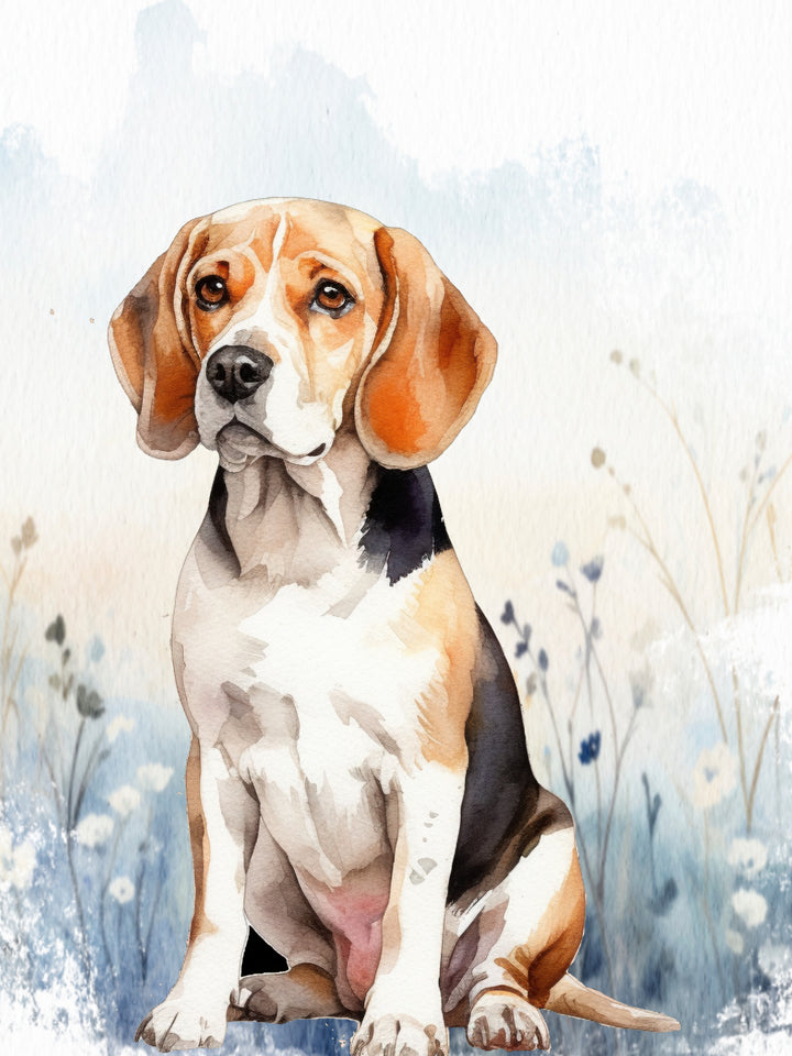 This exquisite watercolour image captures the soulful gaze of a beagle, set against a dreamy, floral background in soft pastel hues. With delicate brushstrokes and a harmonious blend of warm and cool tones, this artwork brings charm and elegance to any space. Ideal for dog lovers, this timeless piece exudes warmth, companionship, and rustic sophistication, making it a perfect addition to a modern farmhouse, cozy living room, or stylish nursery.