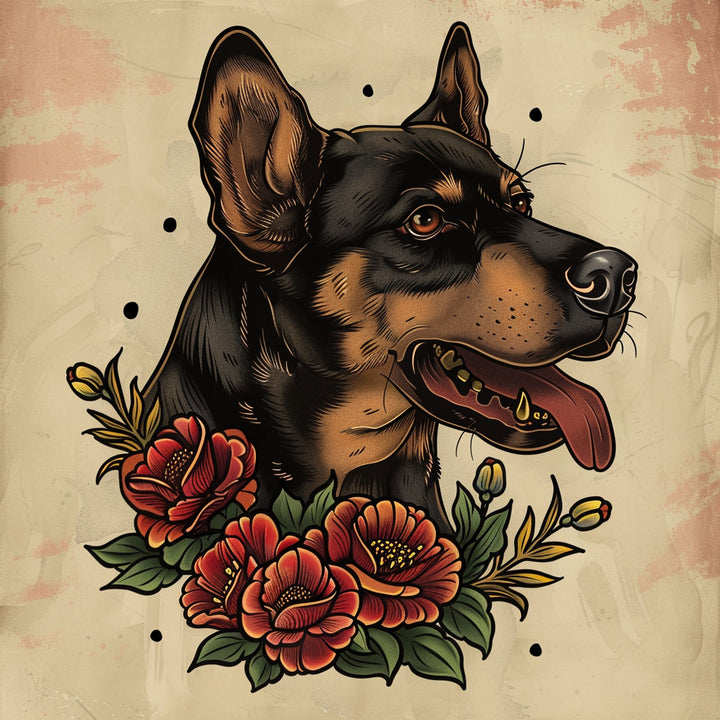 This stunning wall art print showcases a loyal and noble dog, beautifully illustrated in a bold traditional tattoo style. The intricate detailing and rich colour palette bring this canine portrait to life, complemented by striking red flowers that add a touch of elegance and contrast. Perfect for tattoo art lovers, pet enthusiasts, and those seeking a unique statement piece for their home, this print embodies strength, devotion, and timeless artistic craftsmanship. A must-have for those who appreciate vintage-inspired, ink-style artwork.