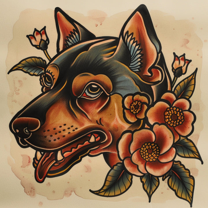 This striking wall art print features a bold and expressive depiction of a dog's head in classic traditional tattoo style. With deep, rich shading, intricate line-work, and a warm colour palette, the piece evokes strength, loyalty, and a touch of nostalgia. Surrounded by delicate yet vibrant flowers, this artwork balances toughness with elegance, making it a perfect statement piece for those who appreciate tattoo artistry and animal symbolism. Printed on high-quality materials, this unique composition will add a bold and timeless aesthetic to any space.