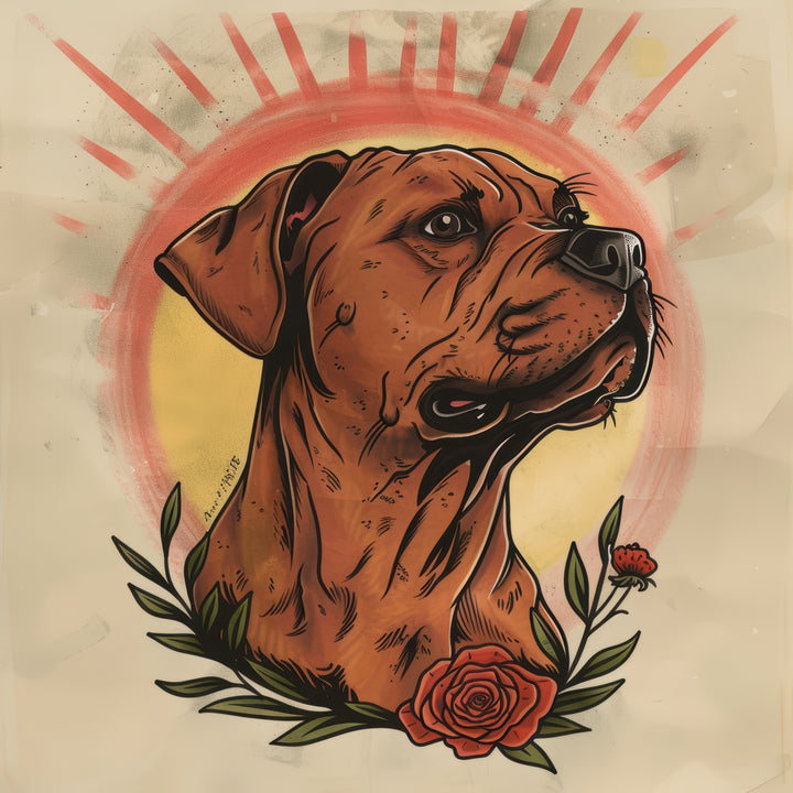 This stunning artwork captures the noble and powerful essence of a Boxer dog, depicted in a bold, tattoo-style illustration. Featuring rich earthy tones, intricate line-work, and a radiant sunburst halo, this piece exudes strength and loyalty. Delicate floral elements, including roses and greenery, add a touch of elegance, making it a perfect blend of toughness and beauty. Ideal for dog lovers, tattoo art enthusiasts, and those who appreciate unique, vintage-inspired designs, this print makes a striking statement in any home or office.