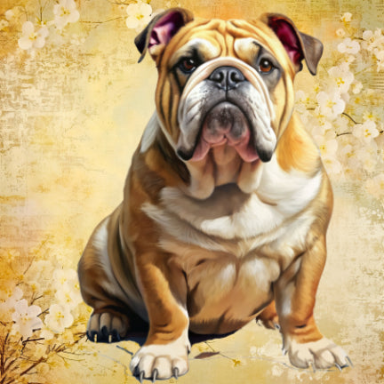 This delightful image showcases a relaxed Bulldog, capturing the breed’s trademark adorable wrinkles and unique expressions. With its stocky build and gentle demeanour, the Bulldog emanates a warm, friendly presence, making it a beloved family pet. The soft lighting adds to the serene atmosphere, highlighting the dog's calm nature and cuteness.