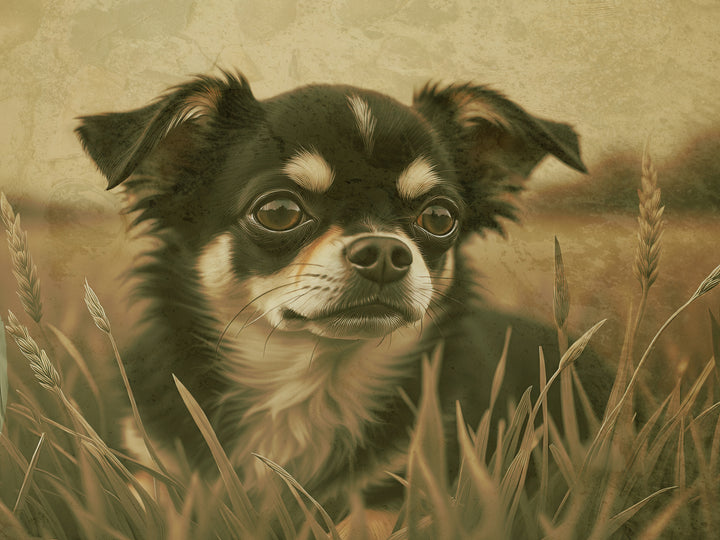 This charming mug showcases a realistic illustration of a Chihuahua puppy nestled among tall grass, capturing its expressive eyes and fluffy fur for an adorable and stylish accessory