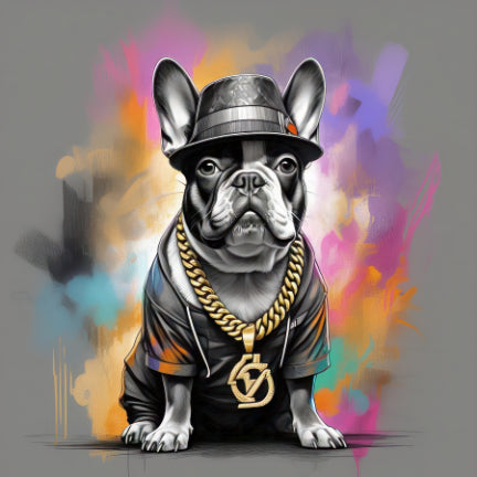 This stylish mug features a vibrant illustration of a French Bulldog dressed in an urban, hip-hop-inspired outfit. The bulldog is depicted wearing a sleek black hat, a gold chain necklace, and a trendy jacket with bold graphics. The background is filled with dynamic, colourful splashes of paint, adding a lively and edgy aesthetic to the design. Perfect for coffee or tea lovers who appreciate both fashion and adorable pets, this mug combines creativity with a playful take on street style.