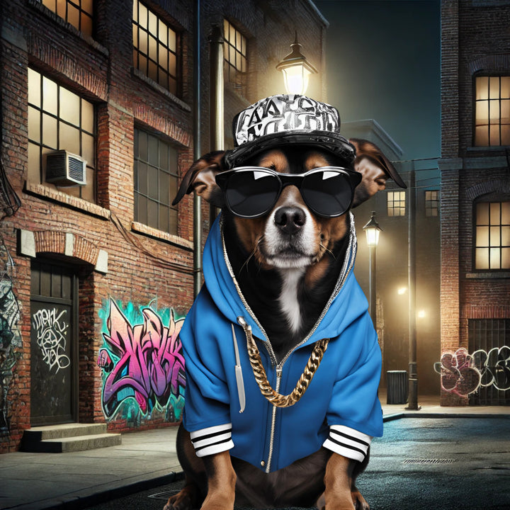 Meet the coolest dog on the block, dressed in hip-hop fashion with a blue hoodie, sunglasses, and a shiny gold chain, giving off serious street vibes. This trendy dog strikes a pose in a graffiti-covered urban alleyway, where neon-lit street lamps cast a soft glow on the brick walls and colourful graffiti art. Perfect for lovers of urban culture, streetwear, and fun animal art, this image blends the gritty charm of city life with a playful touch of canine attitude.