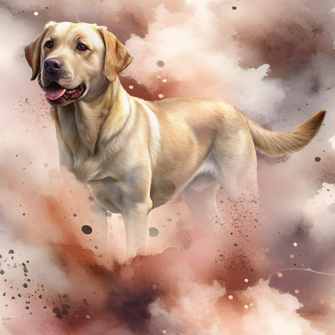 This captivating painting features a golden Labrador Retriever standing gracefully against a dreamy, ethereal background. The dog's warm, friendly expression and slightly open mouth convey a sense of happiness and contentment. The soft, swirling clouds in shades of pink, white, and purple create a magical, otherworldly atmosphere, enhancing the overall serene and uplifting mood of the artwork. The detailed brushstrokes highlight the dog's fur texture, adding depth and realism to the piece.