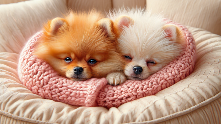 Two sweet Pomeranian puppies snuggle closely together, wrapped in the warmth of a soft pink knitted blanket. Their fluffy coats, one a rich golden-orange and the other a creamy white, contrast beautifully as they rest on a plush cushion. This heartwarming scene captures the essence of comfort, companionship, and the irresistible charm of Pomeranian puppies. Perfect for dog lovers, this image radiates warmth and pure cuteness.