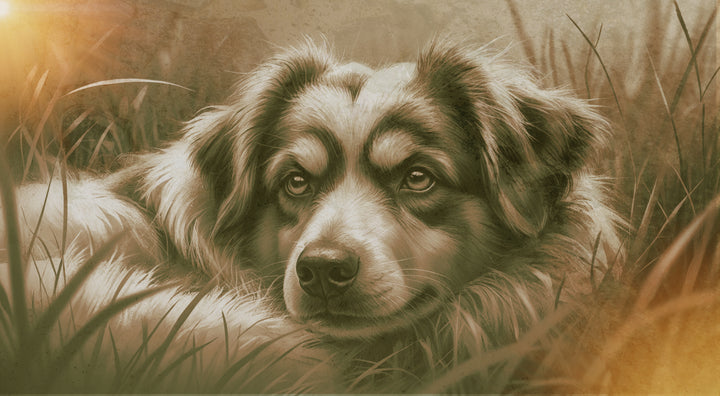 This evocative artwork captures the soulful gaze of an Australian Shepherd resting peacefully in tall grass, and bathed in the warm glow of golden hour light. Rendered in muted sepia tones with a vintage film grain texture, the piece combines realism with a timeless, nostalgic feel. The dog's gentle eyes and soft fur invite a sense of quiet reflection, making it a perfect addition to rustic, nature-inspired interiors or dog-lover art collections.