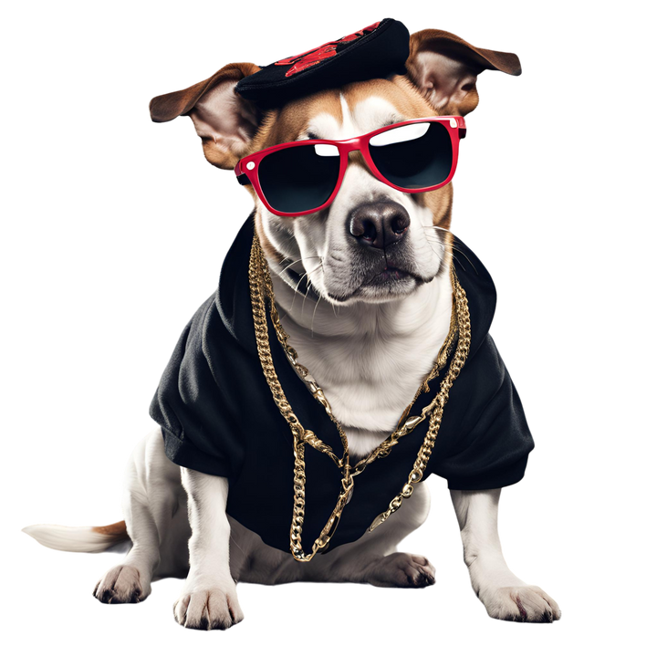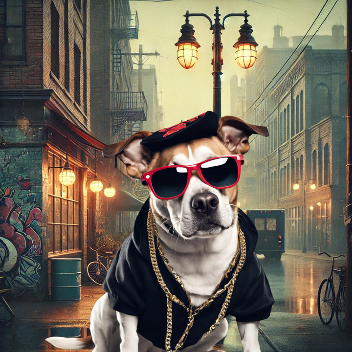 Set against the backdrop of a graffiti-covered city street, the dog's cool demeanour and street-smart look exude hip-hop culture vibes. Perfect for any dog lover or fan of street art, this fun and contemporary piece adds a dose of personality to any space. Whether you're decorating a modern loft or an eclectic office, this artwork will bring a smile and inspire a laid-back, creative atmosphere.