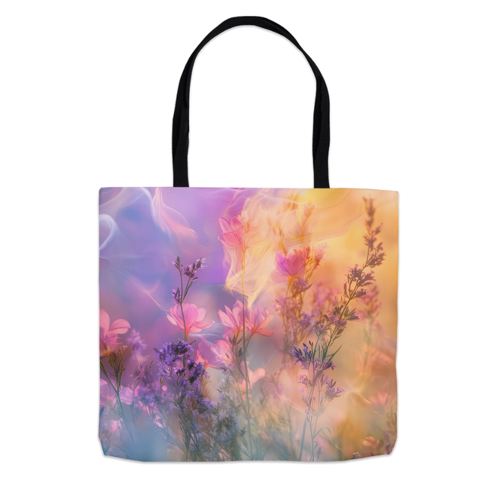 This tote captures a dreamy field of wildflowers bathed in the warm glow of a radiant sunset.