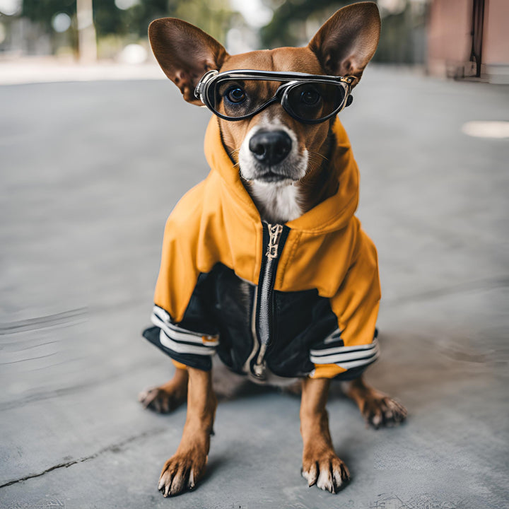 This adorable and fashionable dog is dressed in a vibrant yellow and black hoodie paired with sleek protective goggles, exuding both cuteness and style. Sitting attentively on an urban street, the dog’s playful yet cool vibe is perfectly captured. Whether you're a dog lover or just a fan of quirky fashion, this image adds a fun, lighthearted touch to any space.