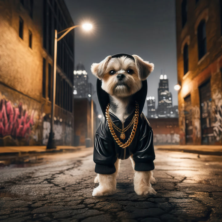 This little Yorkie isn't just cute—it's got serious street cred. Dressed in a sleek black hoodie and adorned with a gold chain, this pup takes on the persona of a true hip-hop artist in a gritty, urban setting. With graffiti-covered brick walls and glowing city lights in the distance, the nighttime city street backdrop adds an edgy, stylish touch. The combination of a tough urban atmosphere and the undeniable charm of this Yorkie makes this image perfect for fans of street culture, hip-hop, and unique pet portraits with attitude.