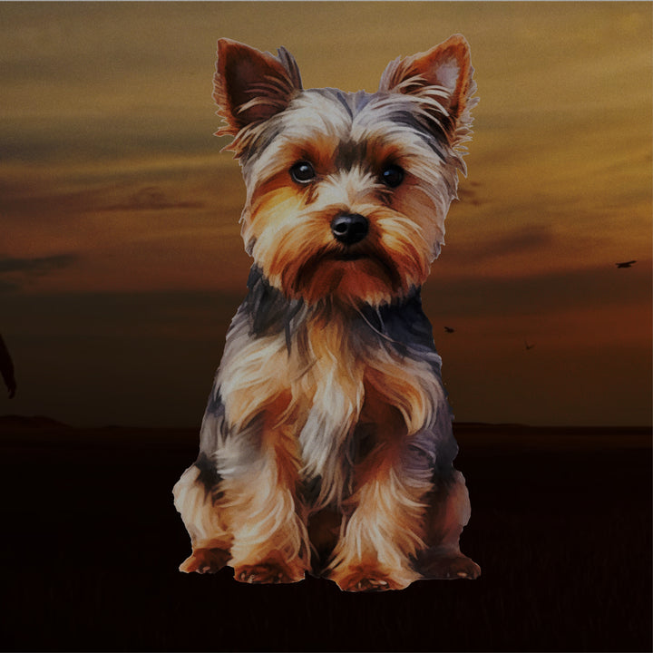 This stunning artwork captures the undeniable charm of a Yorkshire Terrier sitting proudly against a breathtaking sunset backdrop. The rich, warm tones of the twilight sky perfectly complement the silky fur and alert expression of the Yorkie, creating a timeless piece that celebrates the elegance and personality of this beloved breed. Ideal for dog lovers, this print adds a touch of warmth and sophistication to any space, blending nature's beauty with canine affection.